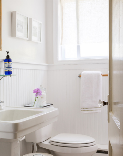 Things that win me over in any home tour? White painted wainscoting, neutral/natural paint colors, high wooden beams, and clean lines. Check, check, check, and check.